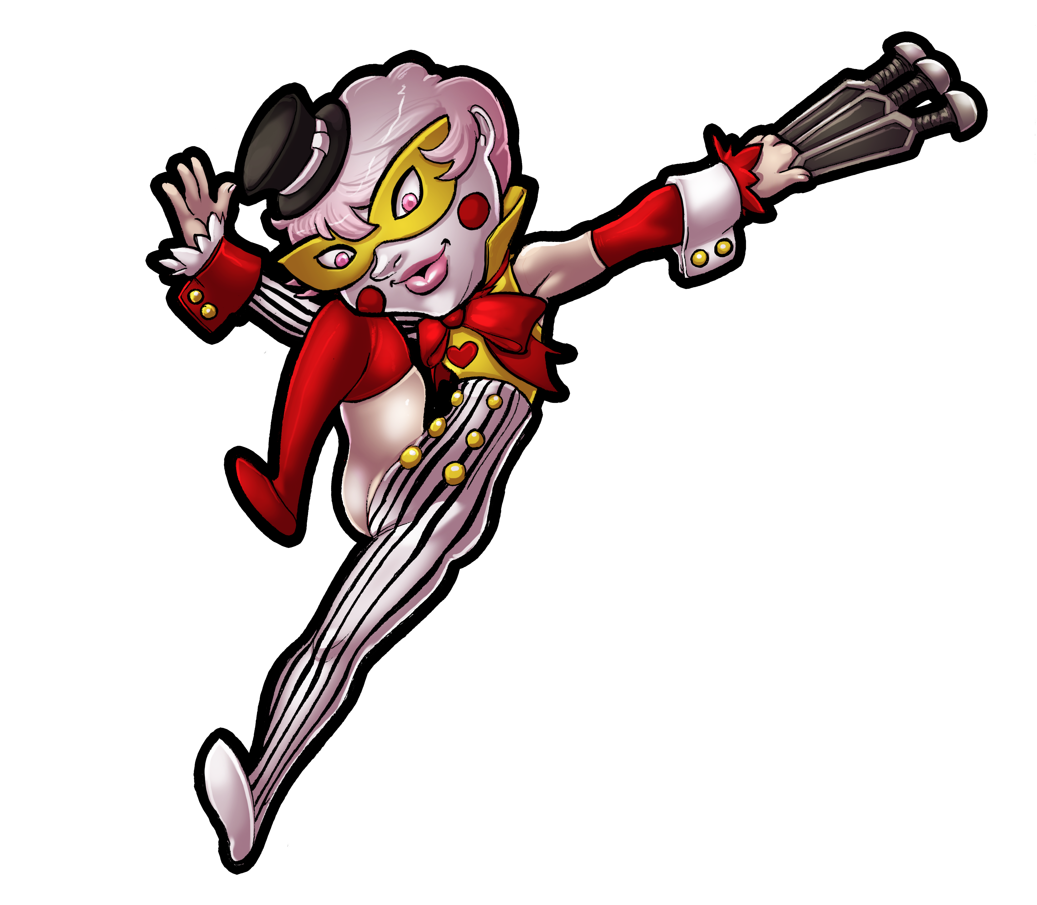 Circus makes good use of her pocket space, using a garish sledgehammer, accented with matching painted streamers, which she could make disappear after each hit, and reappear in a raised position or while spinning to speed up assaults.[4][13] She wielded throwing-knives, which benefited from her enhanced aim.[13][6][4] Furthermore, she carries disguises,[8] as previously mentioned, and road torches and similar for a base from which to summon massive fire-balls with her power.[14]