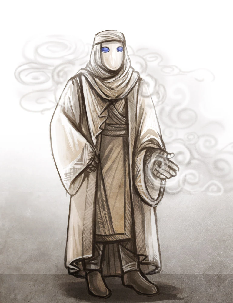 - ↑ He wore a kind of nomadic, desert-tribe style of robe, all in pristine white with a fine pattern embroidered onto it. His mask was more stylistic than representing anything, a solid white plate with light blue lenses for the eyes and no opening for his nose or mouth. What made him stand out was the moisture that flowed from the gaps in his handwraps and from around his mask. It swirled around him like a breath outdoors in winter, pale. - Excerpt from Chrysalis 20.2